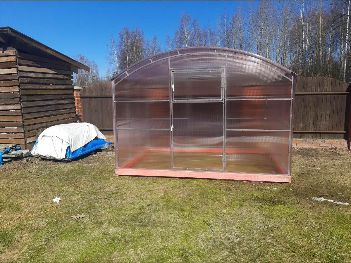 Возможна самостоятельная сборка по подробной инструкции. Сборка теплицы монтажниками-профессионалами компании занимает порядка 3 часов. В качестве основания рекомендуется использовать бетонный, либо деревянный фундамент из бруса. Предварительно брус необходимо обработать антисептиком. Полный комплект состоит из:
